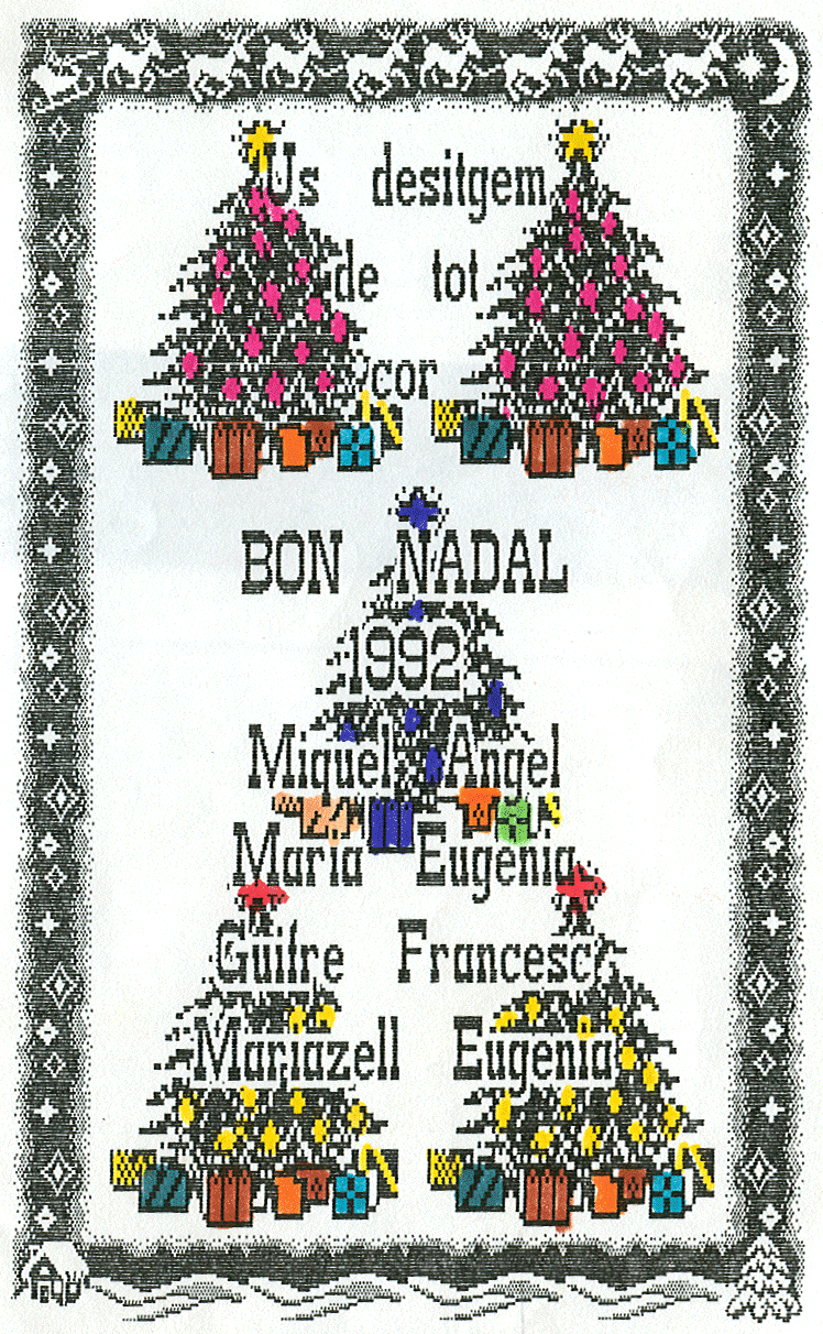 La felicitació nadalenca d’enguany, dissenyada amb tècniques modernes, mostra un contrapunt en aquesta nadala i s’endinsa -la situació actual ens ho obliga- en la història llunyana de la nostra terra, aquell temps en què Catalunya administrava la política i dictava les lleis en la seva pròpia llengua.